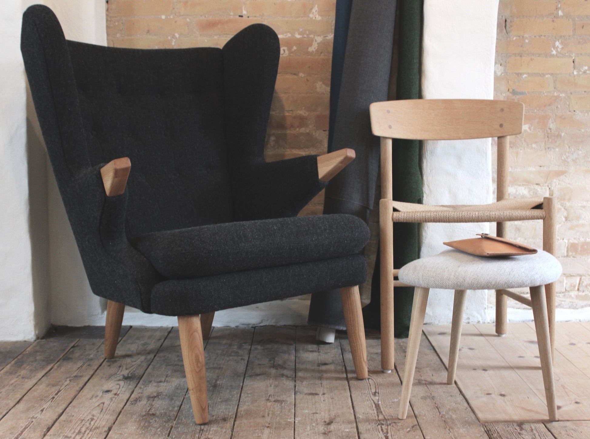 Lidt histore om stolen: I midten af af 50’erne producerede og solgte min farfar tilsvarende bamsestole til møbelforretninger rundt omkring i Danmark. Jeg har udfra gamle billeder og beskrivelser genoptaget designet og sælger dem under navnet BAKS BAMSE. Ben og negle er i olieret egetræ og ryggen er knapsyet.