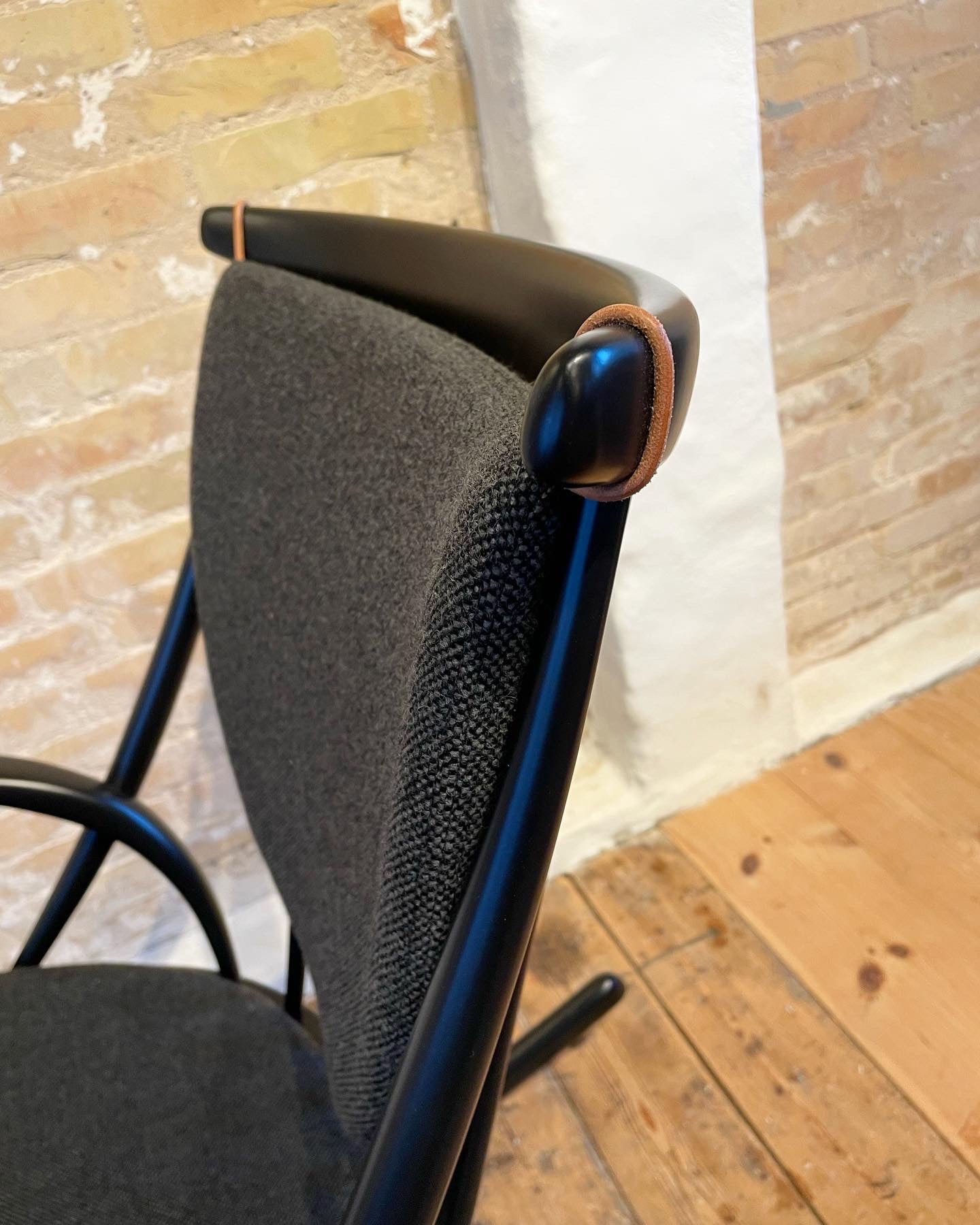 Til dette hyndesæt bruger vores dygtige møbelpolstrer 7 forskellige skabeloner til at lave et enkelt hyndesæt, hvilket sikrer en ensartet kvalitet - her gang. I ryggen er der fastlimet rundskårene 4 mm kernelæderstropper, som monteres rundt om toppen af ryggen på gyngestolen. For ekstra lang levetid, så er kernelæderstropperne er syet på en 4x4 cm læderlap der er limet inden i koldskumshynden.